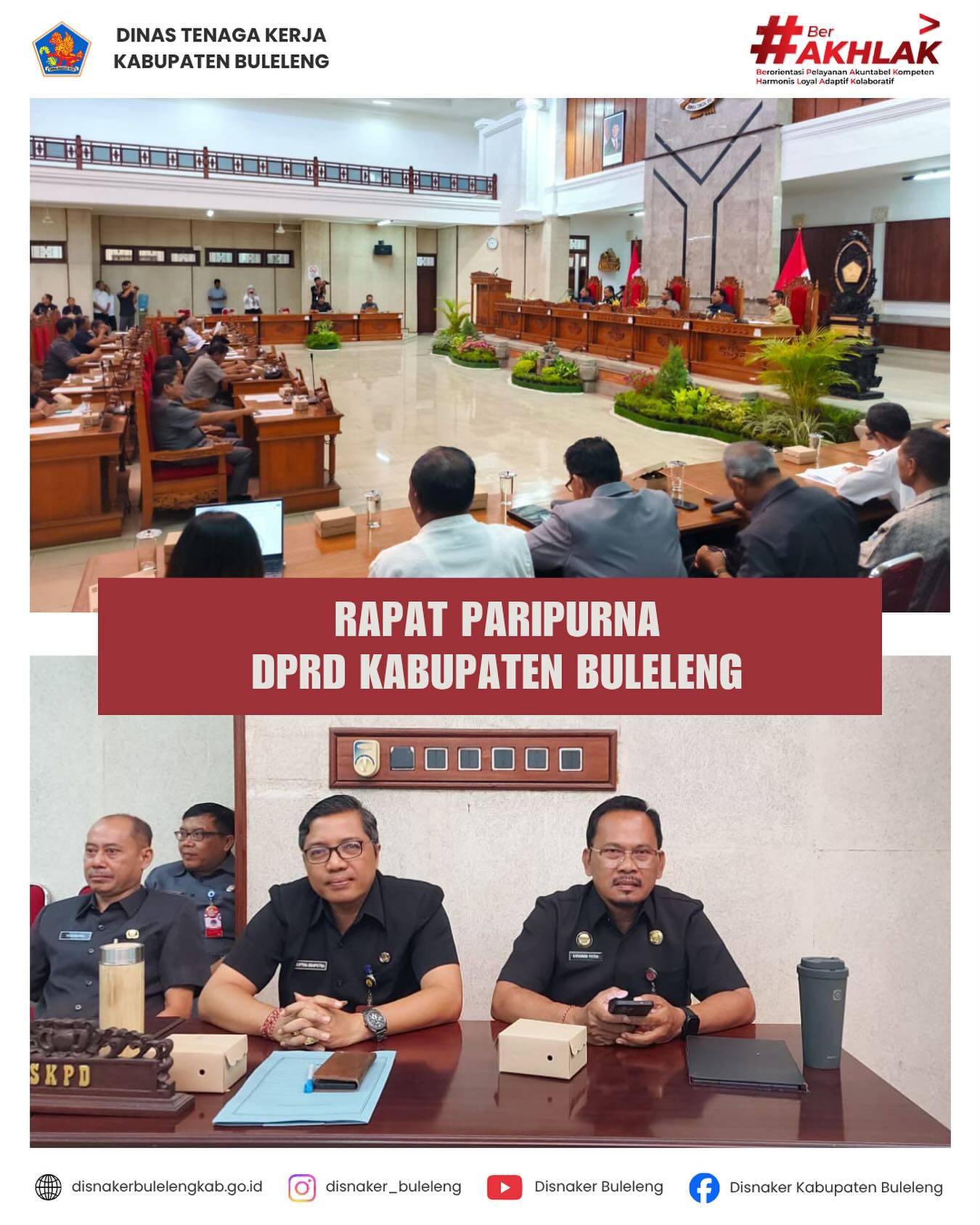Plt. Kepala Dinas Tenaga Kerja Kabupaten Buleleng, I Putu Kariaman Putra, S.Sos., M.M., menghadiri Rapat Paripurna DPRD Kabupaten Buleleng yang bertempat di Ruang Sidang DPRD Kabupaten Buleleng. Rapat tersebut membahas Penandatanganan Persetujuan Bersama atas Rancangan Kebijakan Umum Anggaran (KUA) Tahun Anggaran 2026, Prioritas dan Plafon Anggaran Sementara (PPAS) Tahun Anggaran 2026, serta Penyampaian Penjelasan Bupati Buleleng terhadap Rancangan Peraturan Daerah tentang Perubahan Kelima atas Peraturan Daerah Nomor 13 Tahun 2016 tentang Pembentukan dan Susunan Perangkat Daerah.