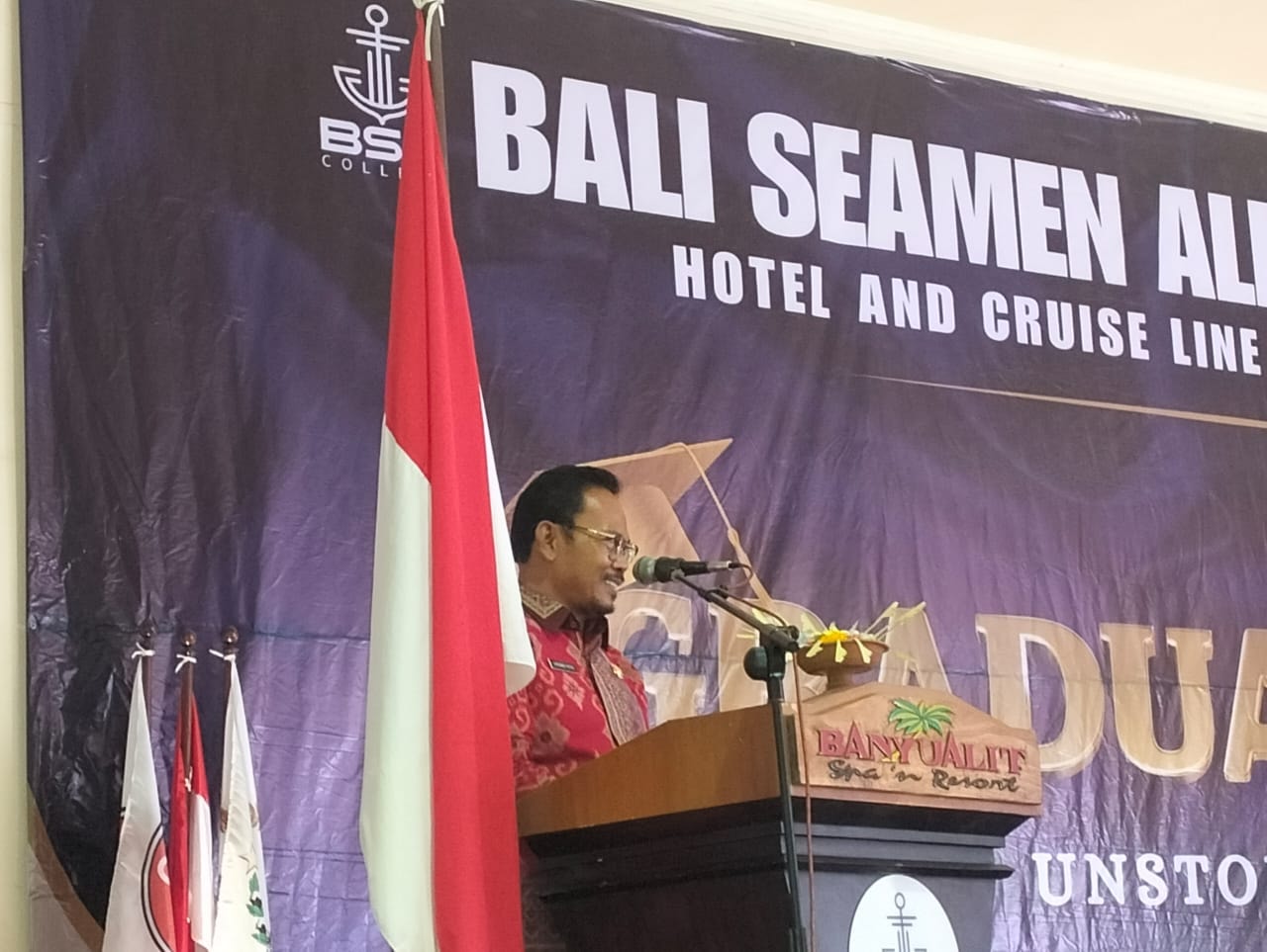 M.M., didampingi oleh Kepala Bidang Pelatihan dan Produktivitas Tenaga Kerja, I Made Sadipa, S.H., menghadiri acara Wisuda Ke-IV LPK Bali Seamen Aliansi (BSA) College Hotel and Cruise Line Training Center yang bertempat di Hotel Banyualit, Singaraja.